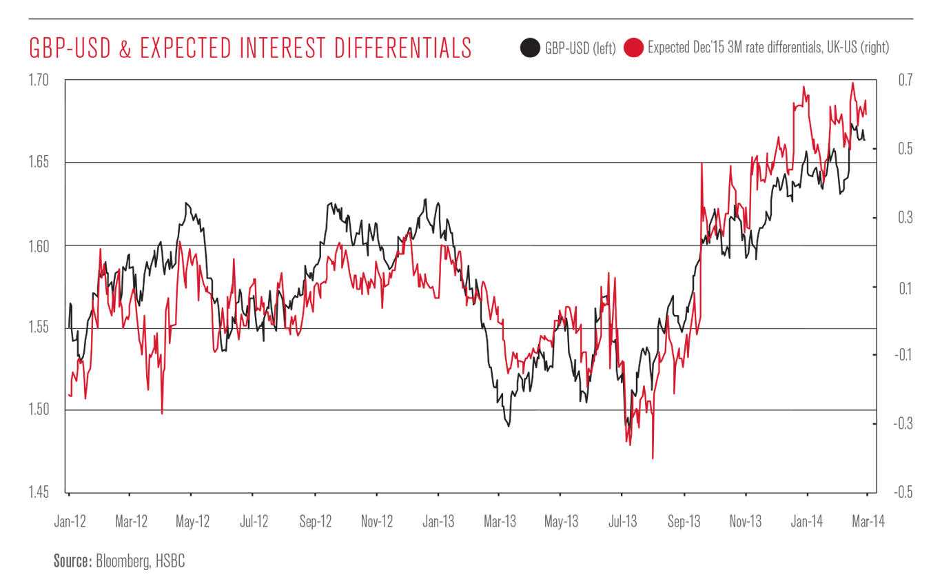 The growing influence of cyclical considerations means carry is evident in the major traded currencies. The graph (below) shows GBP-USD plotted against expectations for where the differential between UK and US three-month rates will be at the end of 2015. We chose such a distant point because the Bank of England and Fed argue that rates will be on hold for some time to come. It shows that the exchange rate has begun to track the interest differential increasingly since mid-2013. The relationship is also evident in EUR. In addition, carry considerations are not confined to these G10 currencies’ behaviour against the USD. For example, AUD-NZD also track their expected interest rate differential closely. We are now back to the world when strong data drives rate expectations and that propels the currency higher.