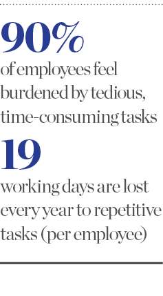 Even among the most productive office workers, it is surprising just how much time and energy is spent on performing repetitive manual tasks every day. According to an independent survey conducted by SnapLogic, 90 percent of employees feel burdened with tedious and time-consuming tasks such as data entry and HR processes. What’s more, these repetitive tasks are costing businesses an incredible 19 working days per year for every employee in terms of lost productivity.