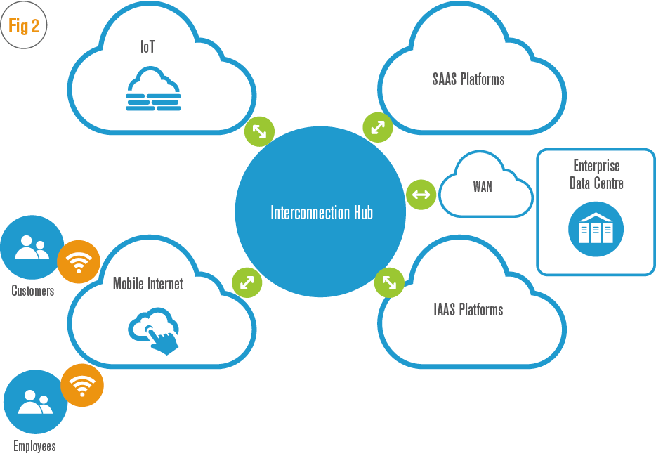 As such, enterprises that are embracing digital transformation are now rethinking their networking strategies. Essentially, they are expanding their network architecture to include interconnection hubs at the edge of the corporate WAN, where they can gain private access to cloud services, while also establishing private connections to customers, business partners and suppliers (see Fig 2).