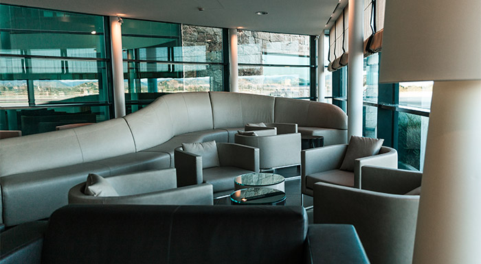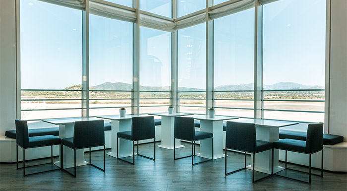 The purpose-built FBO at Olbia Airport is an architectural masterpiece in its own right. Seen from on high it looks like an immense aircraft door, while from ground level its clean, sleek lines seem to swoop skyward like giant wings. As passengers relax in the cocoon-like comfort of the terminal, its elegant lines and the beautifully designed natural and artificial lighting create a sense of absolute privacy and tranquillity.